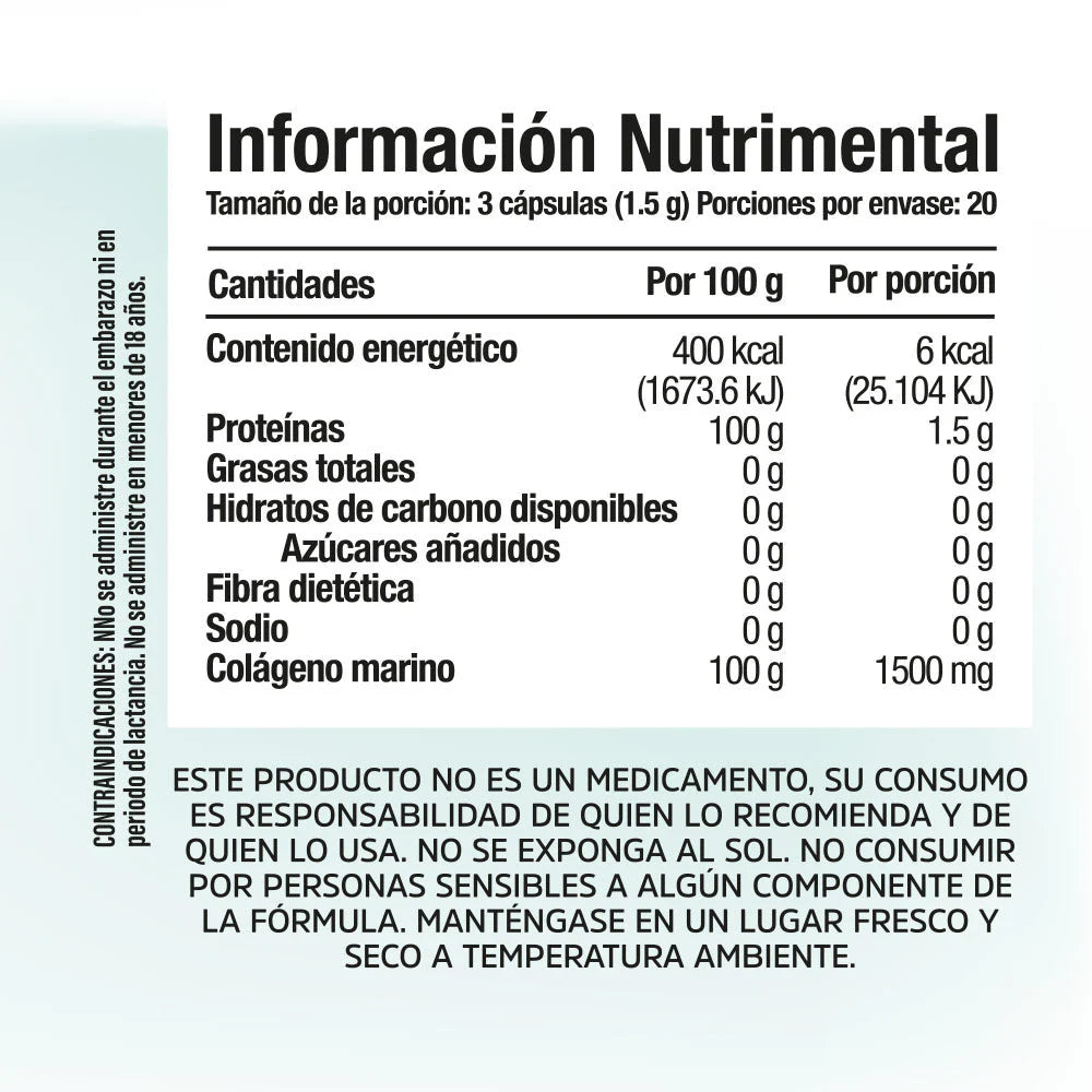 Frasco con 60 cápsulas. Cápsulas a base de colágeno marino.