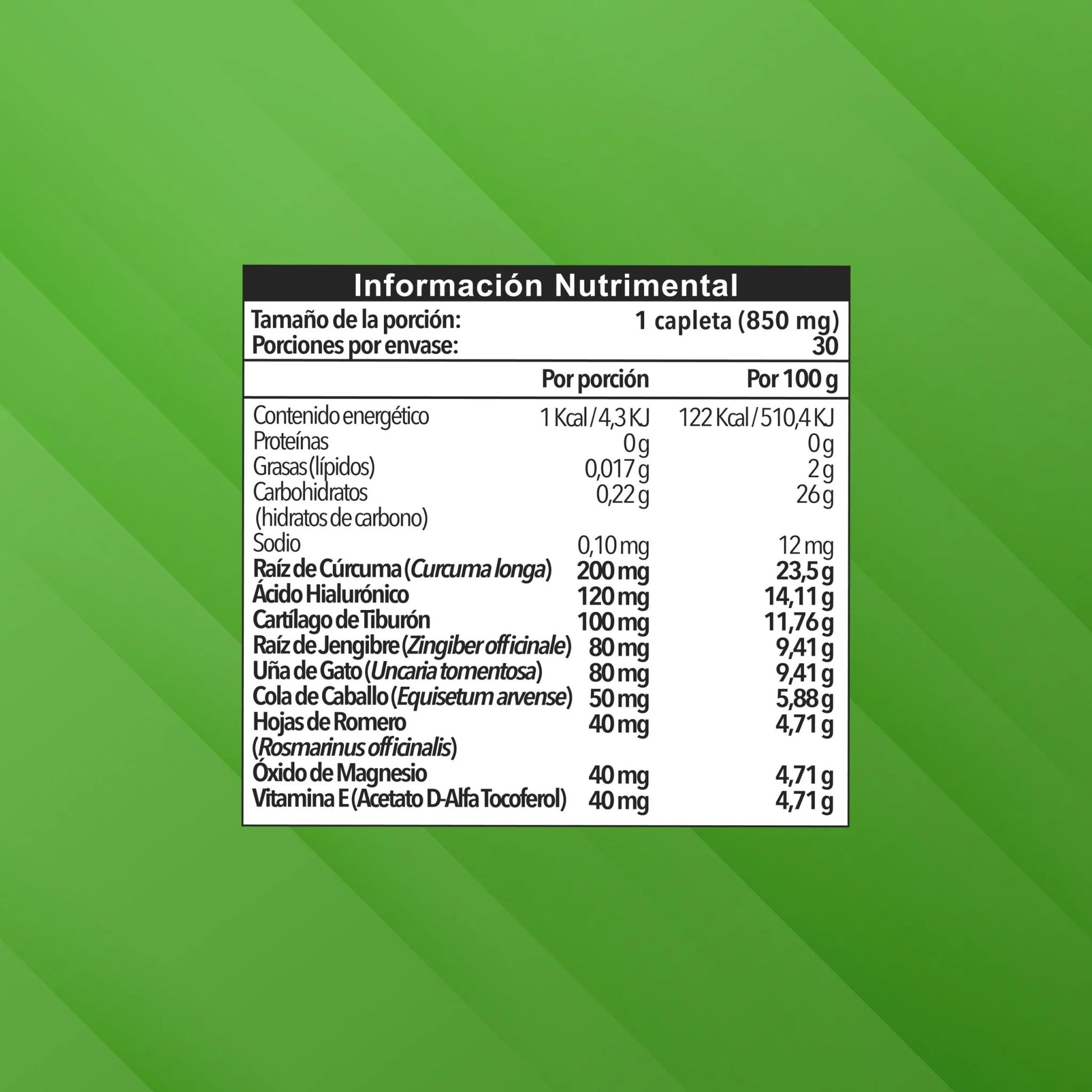 Presentación: Frasco Frasco con 30 capletas 850 mg c/u Ingredientes: Guácima, Encino Blanco, Garra de Diablo, Cancerína, Matarique, Ácido Hialurónico, Cartílago de Tiburón, Raíz de Bardana, Cúrcuma, Óxigo de Magnesio, Vitamina E, Carbonato de Calcio Modo de empleo: Tomar 1 comprimido cada 12 horas. Advertencias:Cosulte a su médico previo a su uso en caso de embarazo, lactancia, tratamiento médico o alguna condición especial. Manténgase fuera del alcance de los niños. Este producto no es un medicamento, su consumo es responsabilidad de quien lo recomienda y de quien lo usa. Manténgase en un lugar fresco y seco.